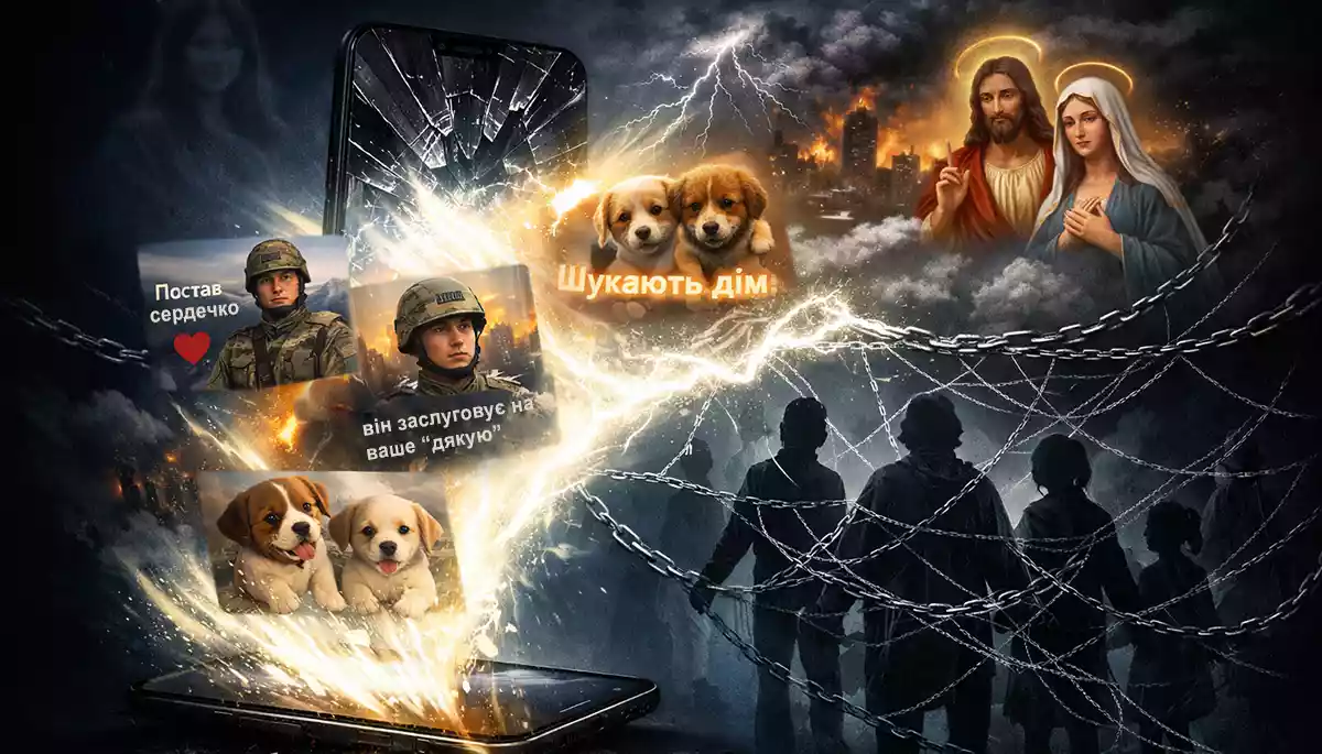 Representatives of the “CAG” do not come to your door in black cloaks with brochures and a doorbell ring. They enter through social media feeds—especially Facebook—in the form of touching images, AI-generated videos with religious icons, posts about soldiers “whom no one congratulated,” and puppies “looking for a home.” All of this works as emotional bait: people like and share these posts, CAG pages gain reach, social media algorithms push them to new audiences, and eventually, users are drawn into closed chats.
