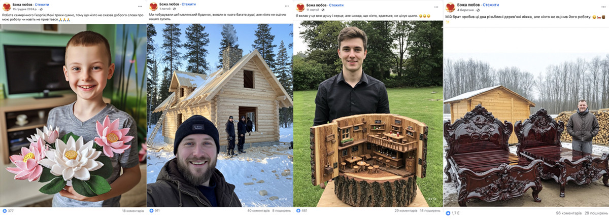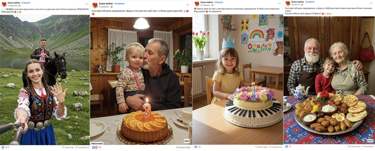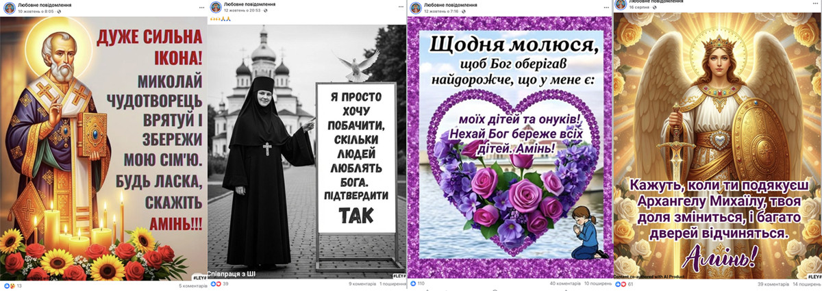 Step 1. Emotional clickbait. CAG publishes AI-generated content on patriotic, everyday, or religious themes to collect likes, comments, and shares. The goal is straightforward: to increase reach and lay the groundwork for the next stage of manipulation. The most common formats include: