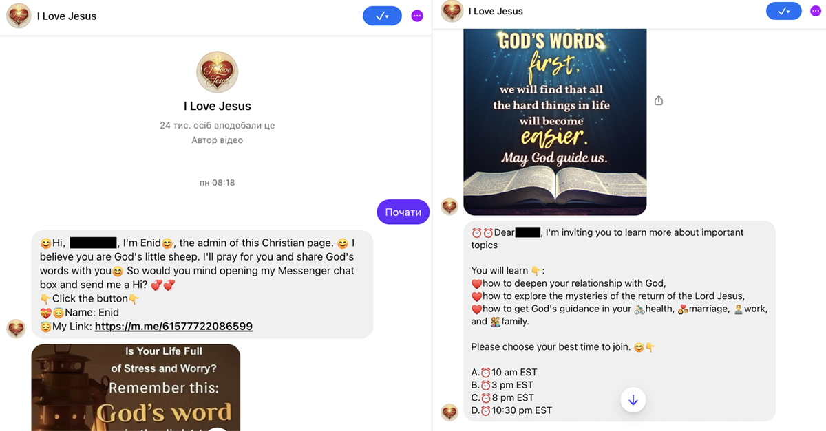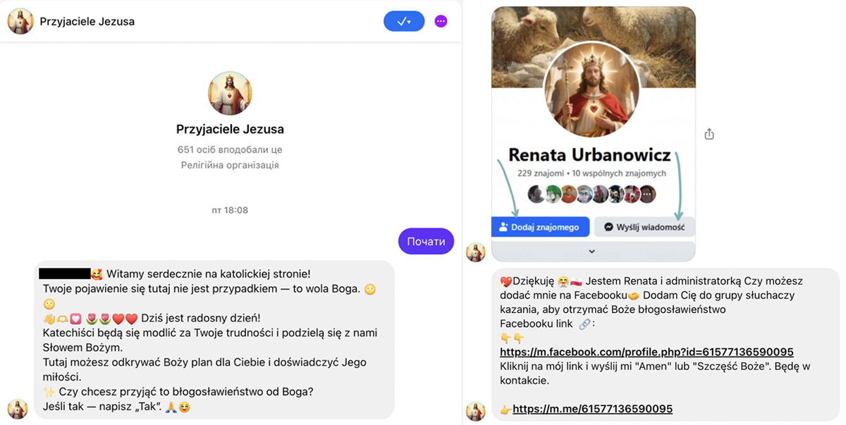Social engineering through familiar imagery. Social engineering is often discussed in the context of phishing, but it also plays a key role in the activity of clickbait pages. In the case of CAG, it “adapts” to the dominant religious identity: in Catholic countries—it poses as Catholic; in Orthodox countries—as Orthodox. Moreover, beyond general religious motifs, it also exploits locally relevant themes (for example, the war in Ukraine).