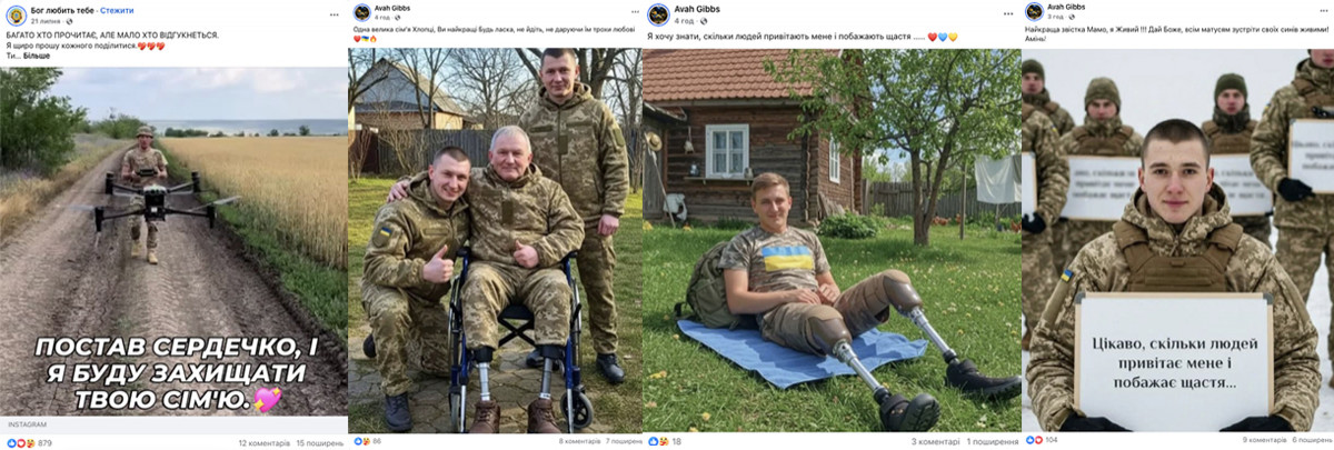 Images of Ukrainian soldiers with “prosthetics,” “on the front line,” set against scenic backdrops, with captions like “He deserves at least one ‘thank you,’” “Give them love,” “Leave a heart and I will protect you,” “I wonder how many people will congratulate me and wish me happiness,” etc.