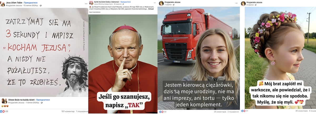 Local adaptation. The clickbait content is slightly adapted to local contexts. It is published in widely used languages, often with noticeable mistakes (as in Ukraine), likely because CAG leadership does not delegate content control to local followers. Emotional narratives are also adjusted: for example, while war-related themes are heavily exploited in Ukraine, in Poland, Catholic symbols and the figure of John Paul II are often used as trust markers.