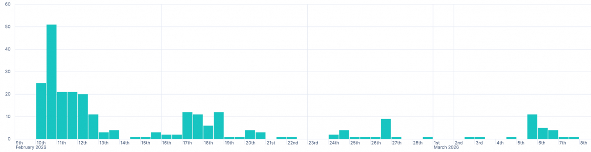 Dynamics of publications in Russian and pro-Russian Telegram channels from February 9 to March 9, 2026. Source: LetsData