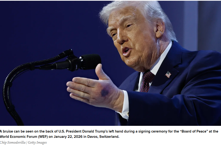 A screenshot from the CNBC article highlights a bruise on the back of U.S. President Donald Trump’s left hand during the signing ceremony of the “Board of Peace” at the World Economic Forum on January 22, 2026, in Davos, Switzerland.